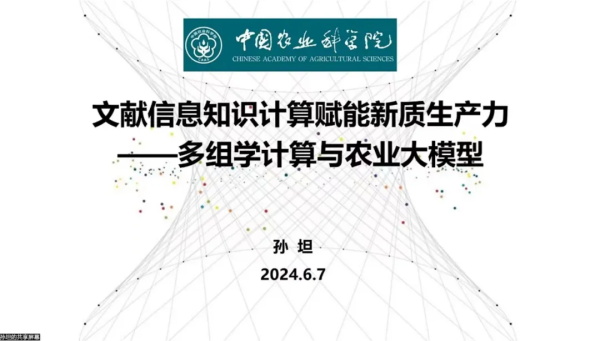 隨后,孫坦研究館員開啟了本期論壇的第一個講座,以“文獻信息知識計算賦能新質生產力”為題,講解自己對于新質生產力的理解,以農科院AI4Science平臺等為案例,聚焦農業領域的多組學計算和大模型,展示文獻信息知識計算探索如何賦能新質生產力,還列舉了基于農業領域大語言模型的各種場景化服務和產品,最后分享了對新質生產力與知識服務雙向賦能機制的思考,以及對文獻信息知識計算賦能新質生產力的路徑展望。