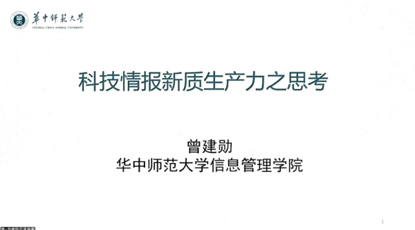 曾建勛教授分享了“科技情報新質生產力之思考”,闡述科技情報+新質生產力的內涵與時代背景、科技情報與新質生產力間相互作用機理,從新質化信息資源、數智化組織方法、新質化服務平臺、數智化分析工具等方面舉例說明如何推進科技情報新質生產力,提出了科技情報新質生產力的發展策略。