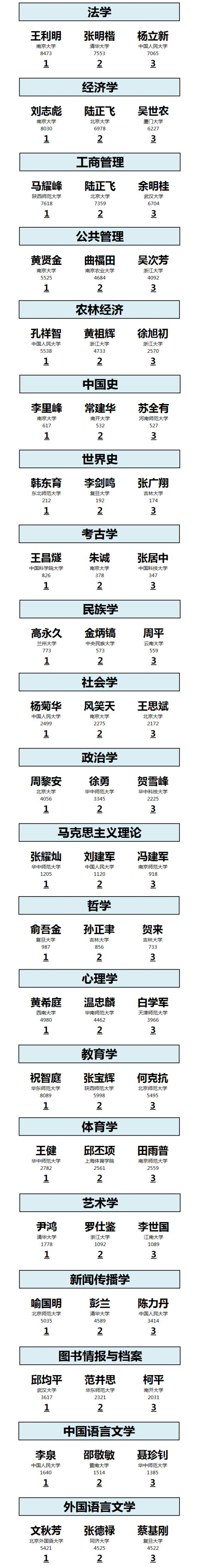 本文以人大重陽官方帳號數據為基礎,總結了人文社科領域21個學科被引頻次最高的前三名學者,時間跨度為(2006-2018,數據采集截止日期為2018年11月5日,具體數據參見人大重陽頭條帳號)。