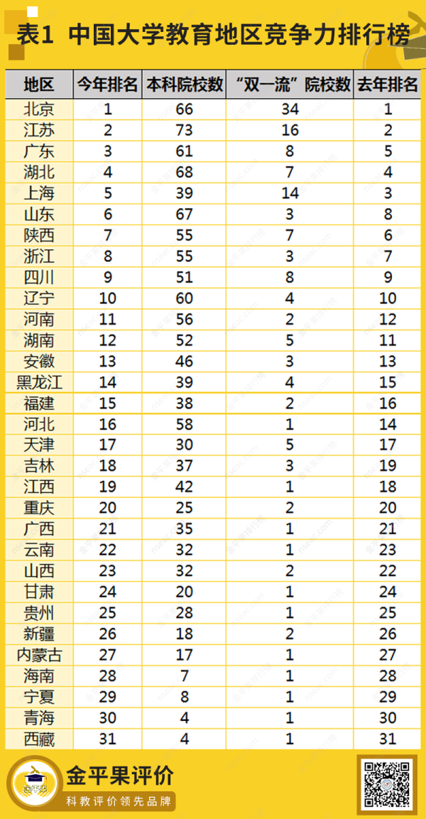 在前300強的名單中,各個地區挺進院校數量差異較大:北京仍以絕對優勢占據首位,共有38所;其次是江蘇,占25所;上海和山東各占19所;浙江和湖北各占15所,其他地區表現欠佳。
