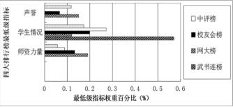 從師資力量指標來看,指標權重由大到小依次為網大榜、中評榜、校友會榜,武書連榜對師資力量指標尚未涉及; 從學生情況指標來看,武書連榜指標占總體權重的 57. 09%,位居第一,其后依次為中評榜、校友會和網大榜; 從聲譽指標來看,武書連和中評榜一般高校指標權重中尚未涉及此項,網大榜權重占總體的 15%,中評榜重點高校占11. 2%,而校友會榜只占 6. 67%。