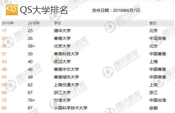 騰訊教育訊 QS全球教育集團(tuán)發(fā)布第十五期QS世界大學(xué)排名,麻省理工連續(xù)第七年世界第一。11所中國大學(xué)進(jìn)入世界百強(qiáng),中國排名最高的清華大學(xué)從世界25位升至第17位,這是自2015年QS采用新排名算法以后,首次有中國大學(xué)進(jìn)入世界前20名。中國大陸共6所大學(xué)進(jìn)入世界百強(qiáng),除清華大學(xué)外,北京大學(xué)排名30,復(fù)旦大學(xué)排名44,上海交通大學(xué)排名59,浙江大學(xué)排名68,中國科學(xué)技術(shù)大學(xué)排名98。
