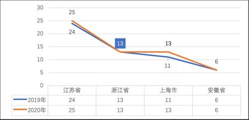 圖1:2019-2020年長(zhǎng)三角四省市“雙一流評(píng)價(jià)報(bào)告”參評(píng)院校數(shù)量統(tǒng)計(jì)圖