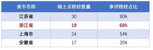 “雙一流評(píng)價(jià)報(bào)告”參評(píng)院校數(shù)量占本省市的大學(xué)數(shù)量的比例可以從另一個(gè)角度表現(xiàn)該省市世界一流大學(xué)建設(shè)情況,由于建設(shè)世界一流大學(xué)對(duì)高校的綜合實(shí)力有一定的要求,在此,我們選取2020年有碩士點(diǎn)的高校進(jìn)行統(tǒng)計(jì)。得到如下表2所示,江蘇省以80%的比例位居第一,浙江省以68%位居第二,高于上海市的54%和安徽省的35%。在一定程度上肯定了浙江省一流大學(xué)建設(shè)的質(zhì)量,也說(shuō)明未來(lái)浙江省建設(shè)一流高校可以從增加參評(píng)院校數(shù)量方面突破瓶頸。