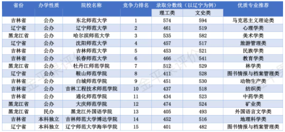 東北地區以遼寧省的錄取分數線為例,分為理工類和文史類,其師范類院校共15所。綜合競爭力排名第一的東北師范大學錄取分數線分別是574分(理工)和594分(文史),其優質推薦專業是馬克思主義理論類。綜合競爭力排名第二的是遼寧師范大學,該院校錄取分數線分別是461分(理工)和519分(文史),主要推薦專業是心理學類。具體情況如下表所示。
