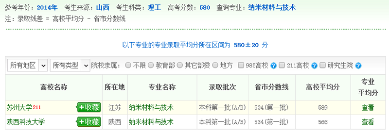 2014年部分高校納米材料與技術(shù)專業(yè)的錄取分數(shù)