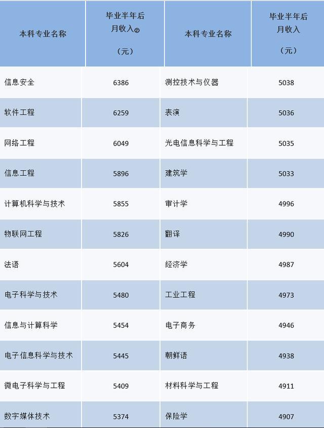 從統(tǒng)計數(shù)據(jù)來看,我國2017屆各專業(yè)畢業(yè)生半年后的平均月收入4774元,一般來說,文科類專業(yè)相對來說要低一些,理工科的工資會稍微高一些。而且還統(tǒng)計了我國畢業(yè)半年后月收入最高的50個本科專業(yè)。其中排名最高的是信息安全專業(yè),達(dá)到了6386元,比全國平均收入高出了1612元,緊隨其后的是軟件工程和網(wǎng)絡(luò)工程專業(yè),這兩個專業(yè)的月收入分別是6259元和6049元,也都超過了6000元。此外,平均月收入超過5000元的共有26個專業(yè),這些專業(yè)主要集中在計算機(jī)、互聯(lián)網(wǎng)、工程類、信息類等專業(yè)中。