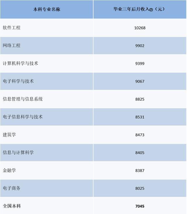 當然,看一個專業(yè)的發(fā)展情況,不能僅看眼前,麥可思研究院還對各專業(yè)三年后的月收入進行了一個調查,結果發(fā)現(xiàn)軟件工程的發(fā)展是最好的,三年的薪資待遇超過了10000元,緊隨其后的是網絡工程(9902)、計算機科學與技術(9399)、電子科學與技術(9067)、信息管理與信息系統(tǒng)(8825)和電子信息科學與技術(8531),如果對上面的專業(yè)進行匯總我們就會發(fā)現(xiàn),計算機、互聯(lián)網和電子科技等專業(yè)的發(fā)展是最好的。
