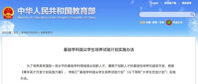 據教育部網站公布的“基礎學科拔尖學生培養試驗計劃實施辦法”顯示,教育部、中組部、科技部、中科院、財政部組成指導組,負責計劃實施的宏觀指導,提供政策和經費支持。